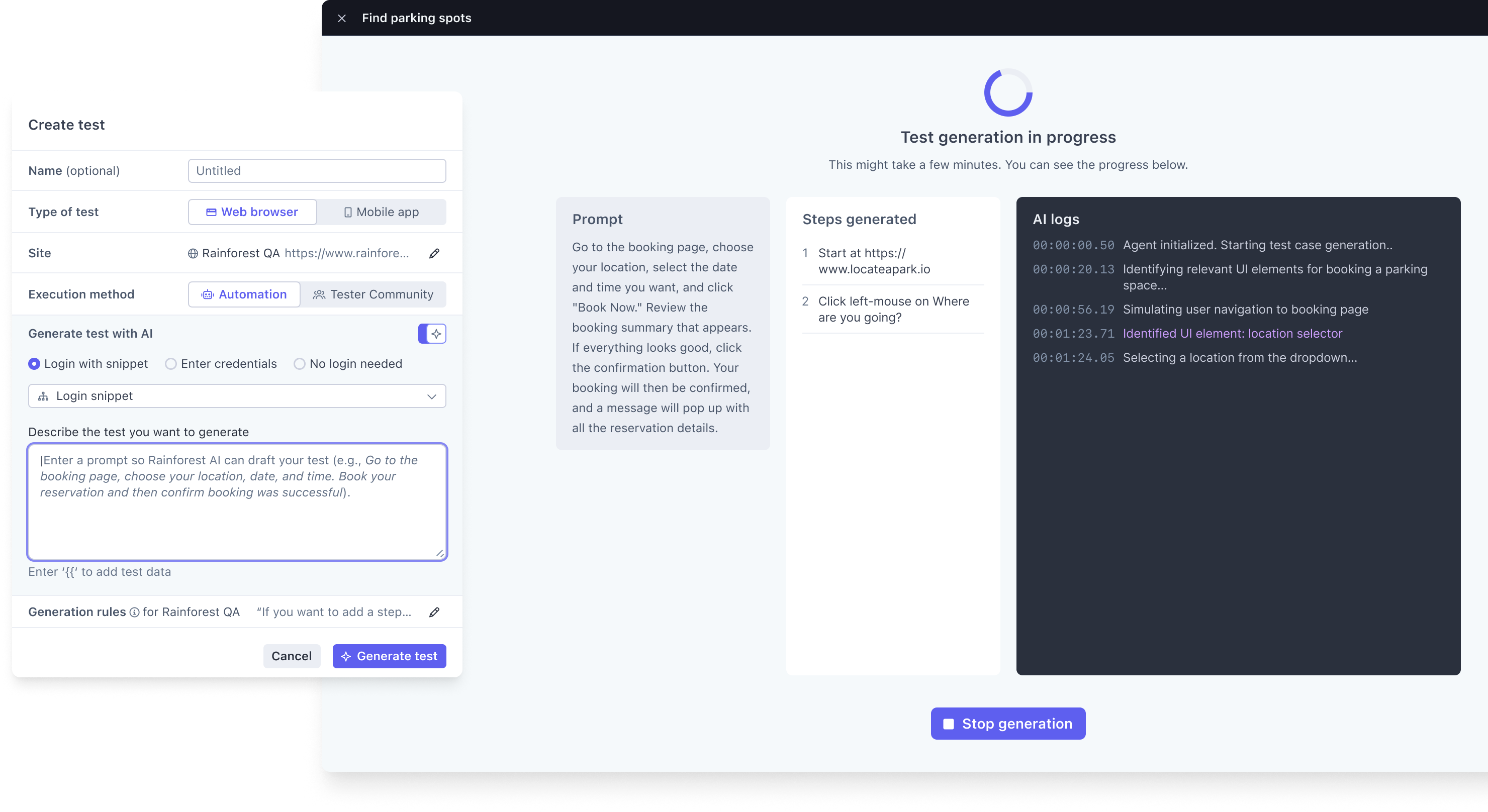 Rainforest can generate draft tests for you based on a prompt and the credentials. It's important to note that the test generated may not be perfectly set up to run without any modifications, but it can save you 80-90% of the time it would take to write a test by doing most of the heavy lifting, and by allowing multiple requests to work in parallel.